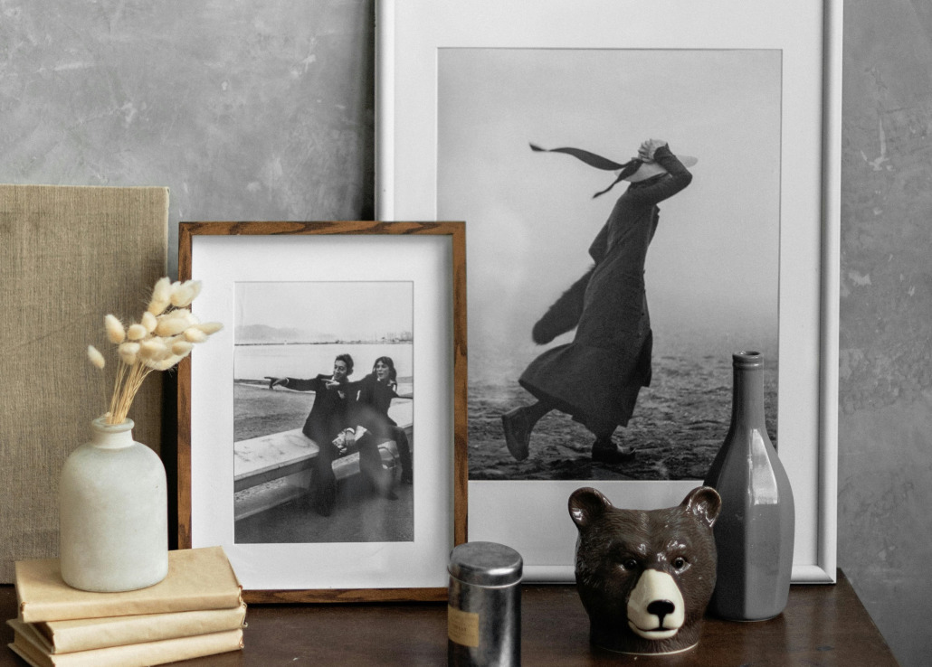 Eine klassische Möglichkeit, Ihre Bilder zu präsentieren, sind gerahmte Fotos. Wählen Sie elegante Rahmen, die zu Ihrer Einrichtung passen – wie moderne Metallrahmen für einen zeitgemäßen Look oder verschnörkelte Holzrahmen für einen Vintage-Stil.