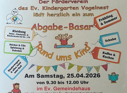 Die Nummernvergabe ist am Donnerstag, den 19.03.2026, ab 07:00 Uhr unter dieser Mailanschrift! (basar.vogelnest@web.de) In den darauffolgenden Tagen erhalten Sie von uns eine Antwortmail mit den ganz genauen Basarbedingungen (grob: 50 Teile Kleidung!!! Zuzüglich 50 Teile Spielsachen, Bücher etc.) oder eventuell einer Absage! Etikettenvergabe
