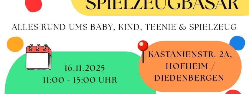 Wir laden zum kunterbunten Kinder- und Spielzeugbasar im Kindergarten Kunterbunt in Hofheim-Diedenbergen ein (Selbstverkäufer). Von Baby bis Teenies und Spielzeug ist alles dabei. Schwangere haben bereits am 10:30 Uhr Einlass. Euch erwartet zudem eine große Los-Tombola mit vielen tollen regionalen Gewinnen.